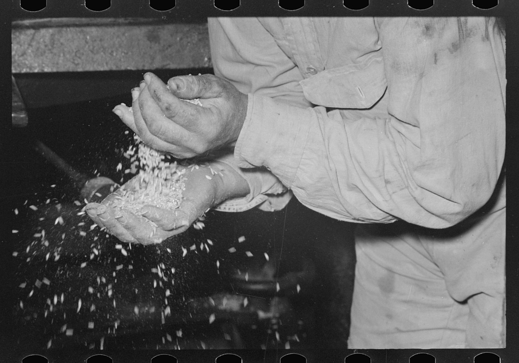 Image Credit: Russell Lee “Examining rice to determine progress of milling operation, Crowley, Louisiana, state rice mill” (1938) Public domain image courtesy of The Library of Congress.